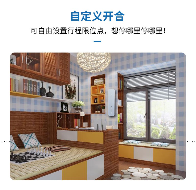 此產品適用于拉珠卷簾,可以把傳統的拉珠卷簾改變為智能電動窗簾,安裝簡單,操作方便。安裝后可通過遙控器、語音、手機APP等控制窗簾升降。